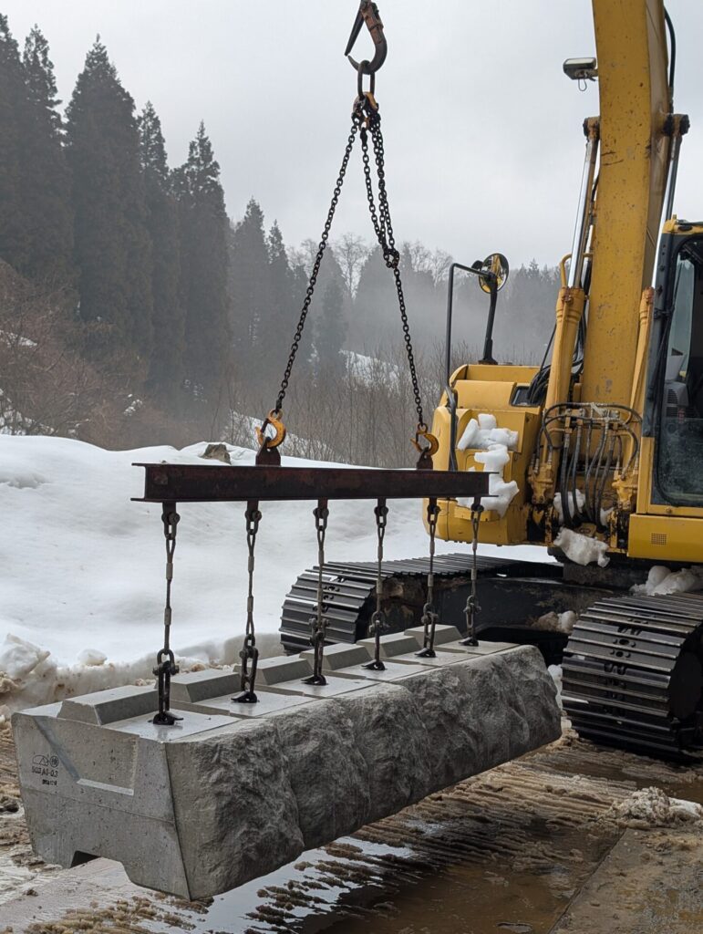 クレーンで吊ってゆっくり下におろします。