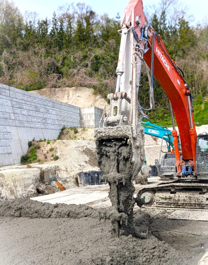 A.現場の土と「**セメント系固化材」という、土を固める専用の材料を混ぜています。今ある土を捨てずに再利用できるので、環境にも優しい工法です。