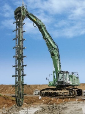 この特殊な機械(**トレンチャ式撹拌(かくはん)混合機)を使って、構造物の強固な基礎地盤を造っています。