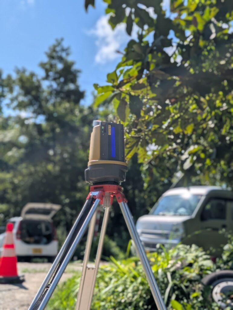 従来の測量では、一人が機械を覗いてもう一人がミラーを持つなど、最低でも二人必要でした。
