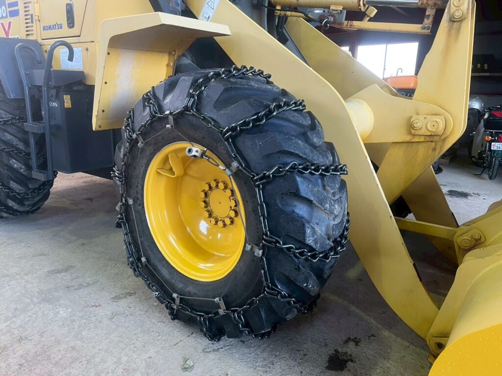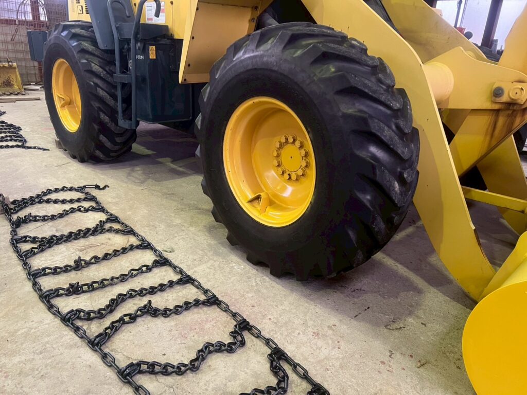 当社でも先日、除雪作業の主役となるタイヤショベルへのチェーン装着作業が完了しました。